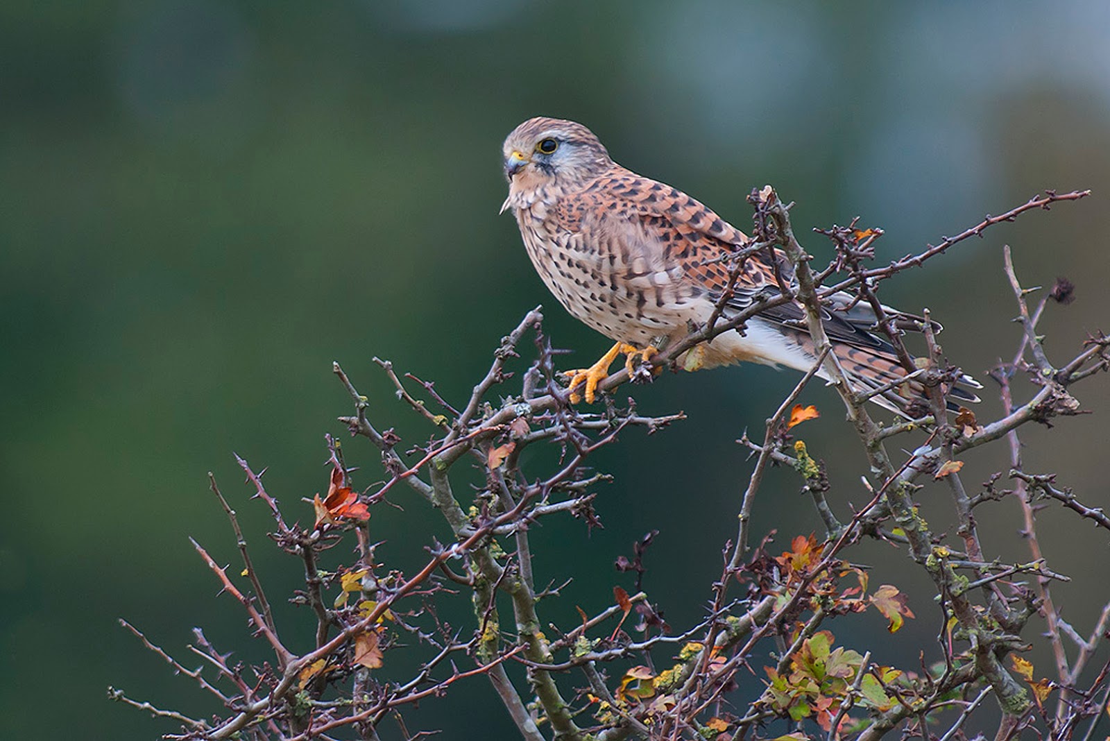 Onderweg zag ik o.a. een paartje torenvalken op en in een meidoornstruik waaraan nog enkele kleurige herfstblaadjes zaten. Het vrouwtje zat bovenop de struik, maar het mannetje bleef in de struik zitten zodat ik er geen goede foto van kon maken.